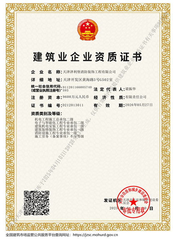 天津津利堡消防裝飾工程有限公司是注冊(cè)于天津經(jīng)濟(jì)技術(shù)開(kāi)發(fā)區(qū)、具有獨(dú)立企業(yè)法人資格的工程公司,是專(zhuān)門(mén)從事消防系統(tǒng)的設(shè)計(jì)、安裝、供貨、維修、保養(yǎng)及咨詢(xún)服務(wù)的現(xiàn)代化企業(yè)。具有建設(shè)部頒發(fā)的消防行業(yè)最高等級(jí)資質(zhì):消防設(shè)施工程專(zhuān)業(yè)承包壹級(jí)資質(zhì)、消防設(shè)施工程設(shè)計(jì)專(zhuān)項(xiàng)甲級(jí)資質(zhì),同時(shí)具有建筑裝修裝飾工程專(zhuān)業(yè)承包壹級(jí)資質(zhì)、建筑機(jī)電設(shè)備安裝工程專(zhuān)業(yè)承包壹級(jí)資質(zhì)、電子與智能化工程專(zhuān)業(yè)承包貳級(jí)資質(zhì)、機(jī)電工程施工總承包貳級(jí)資質(zhì)、施工勞務(wù)(備案事項(xiàng))不分等級(jí)資質(zhì),符合應(yīng)急管理部發(fā)布的《消防技術(shù)服務(wù)機(jī)構(gòu)從業(yè)條件》,消防設(shè)施維護(hù)保養(yǎng)檢測(cè)及消防安全評(píng)估的相關(guān)信息已錄入應(yīng)急管理部的社會(huì)消防技術(shù)服務(wù)信息系統(tǒng),并取得電氣裝置消防安全檢測(cè)資質(zhì)。