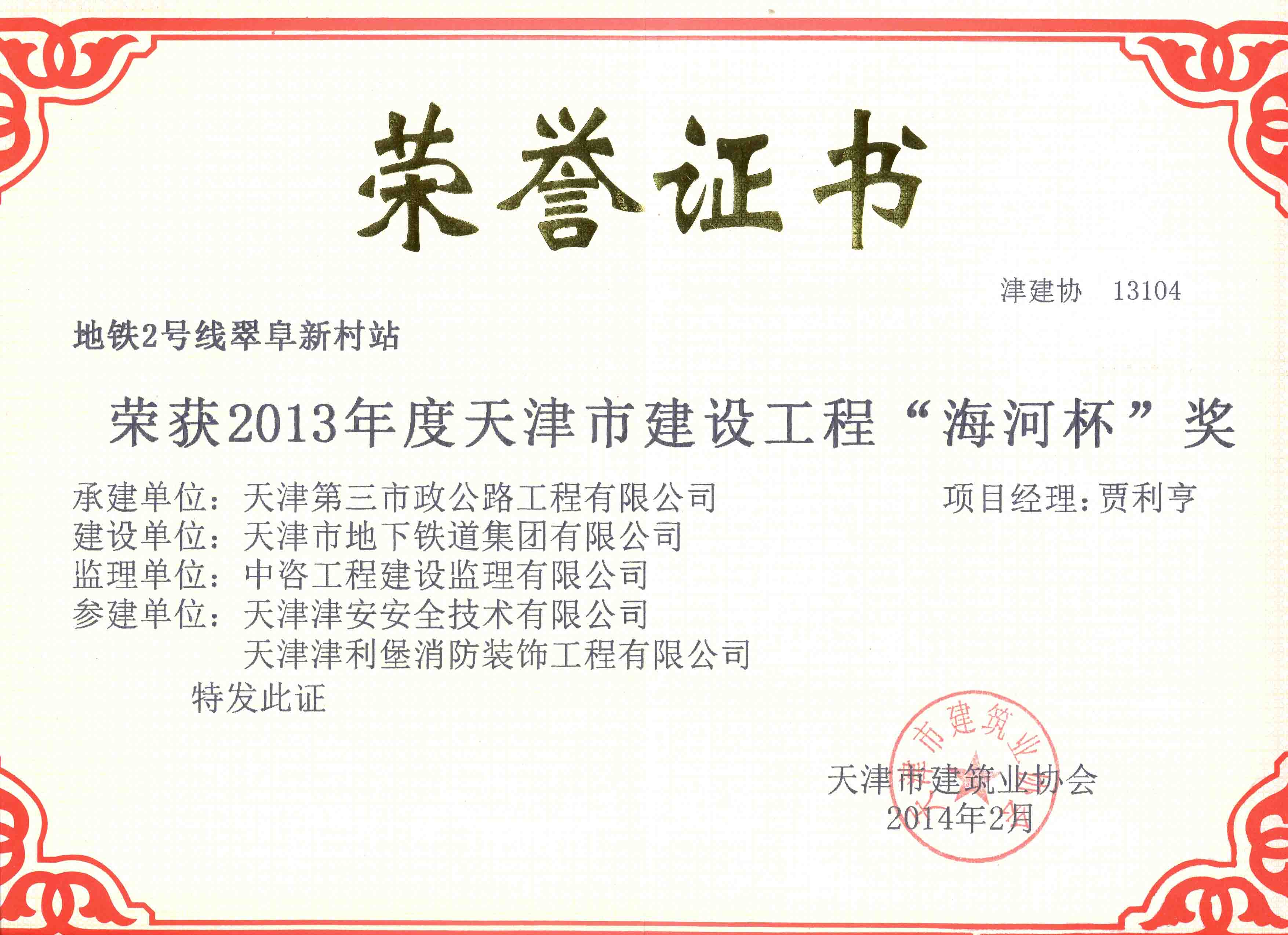 天津地鐵2號線翠阜新村站榮獲“海河杯”獎