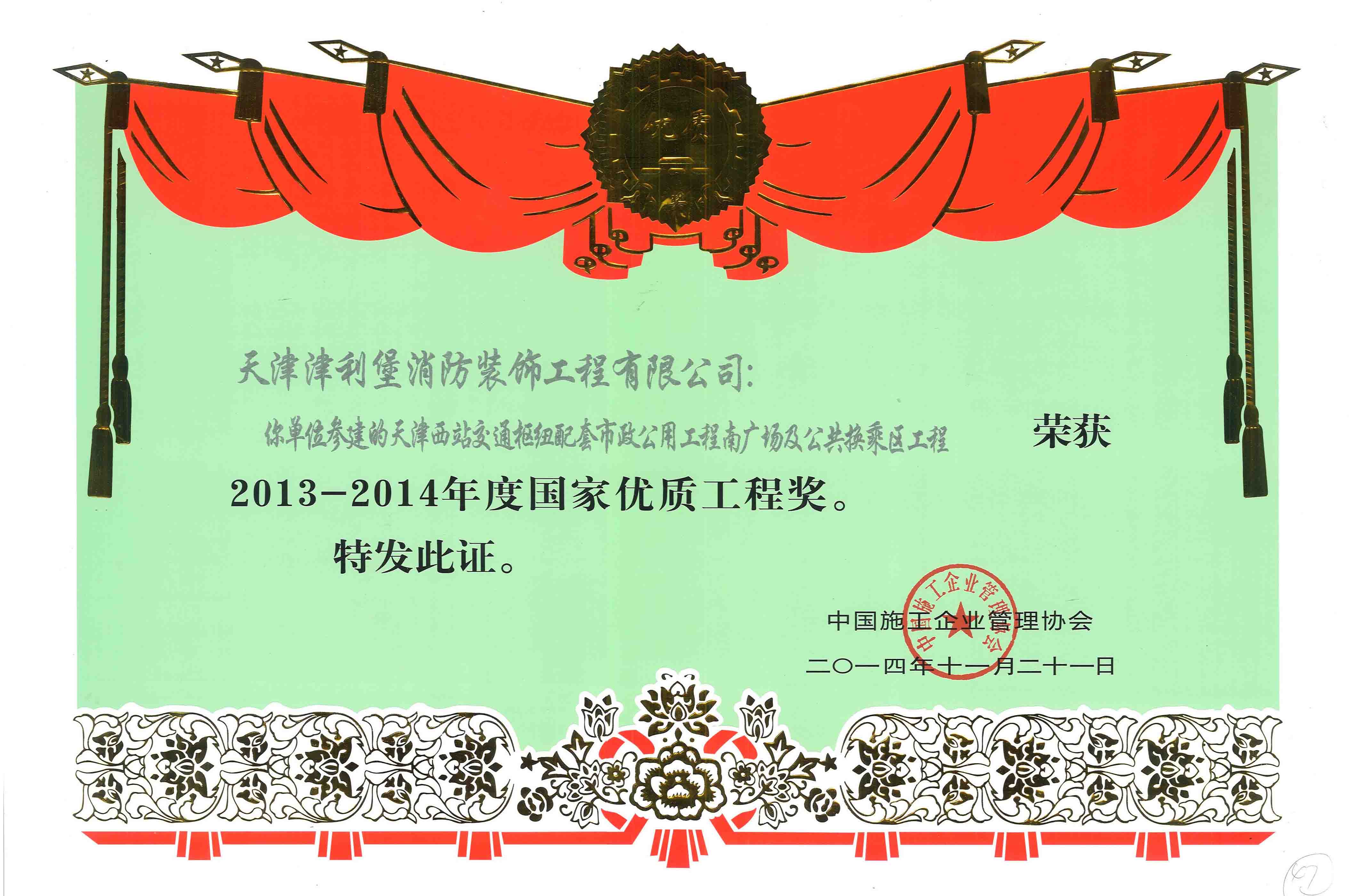 天津西站交通樞紐配套市政公用工程榮獲2013-2014年度國(guó)家優(yōu)質(zhì)工程獎(jiǎng)