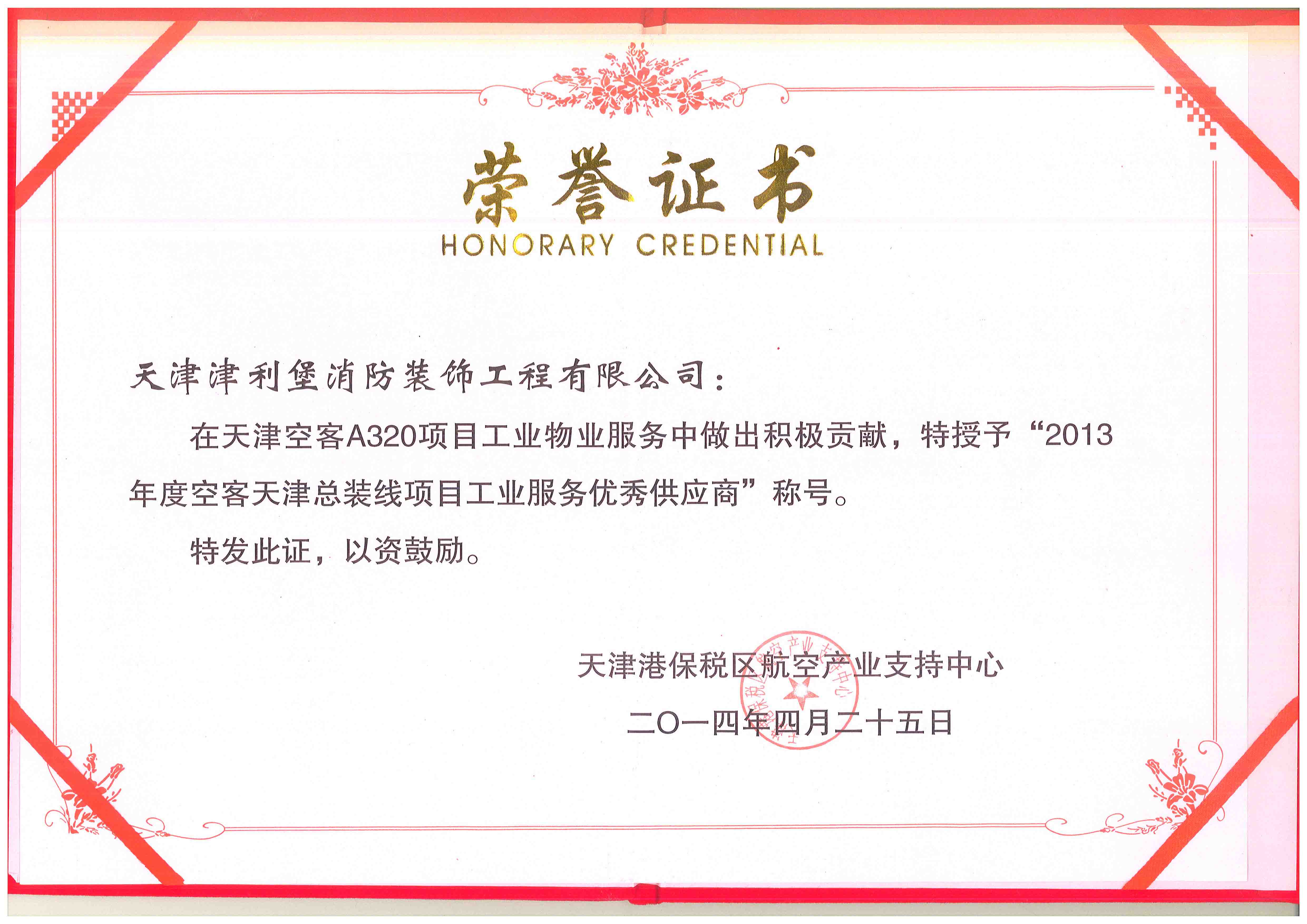 津利堡公司榮獲“2013年度空客天津總裝線項(xiàng)目工業(yè)服務(wù)優(yōu)秀供應(yīng)商”榮譽(yù)稱號(hào)