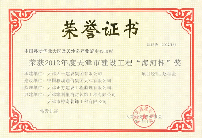 中國移動華北大區(qū)及天津公司物流中心項目榮獲“海河杯”獎