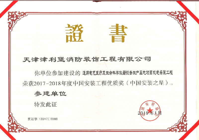 通用電氣醫(yī)療及生命科學(xué)儀器設(shè)備生產(chǎn)基地項(xiàng)目機(jī)電安裝工程榮獲“2017-2018年度中國安裝工程優(yōu)質(zhì)獎(jiǎng)(中國安裝之星)”榮譽(yù)稱號