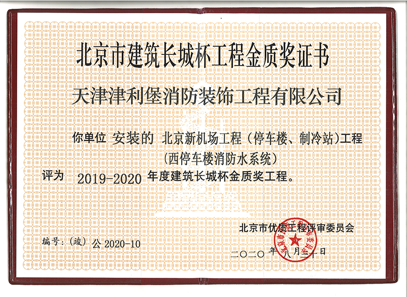 北京新機場工程(停車樓、制冷站)工程(西停車樓消防水系統(tǒng))項目榮獲“2019-2020年度北京市建筑長城杯工程金質(zhì)獎”榮譽稱號