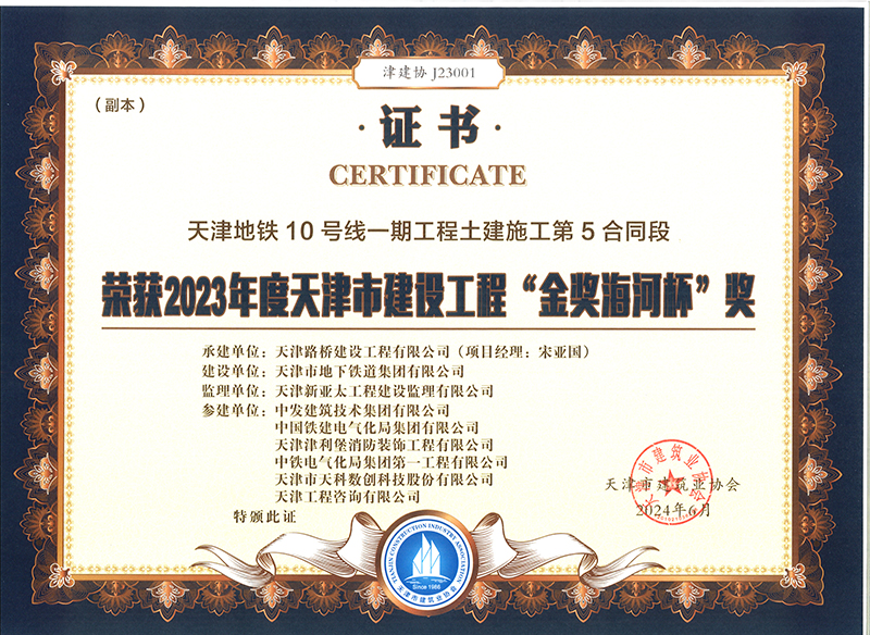 天津地鐵10號(hào)線一期工程土建施工第5合同段榮獲2023年度天津市建設(shè)工程“金獎(jiǎng)海河杯”獎(jiǎng)
